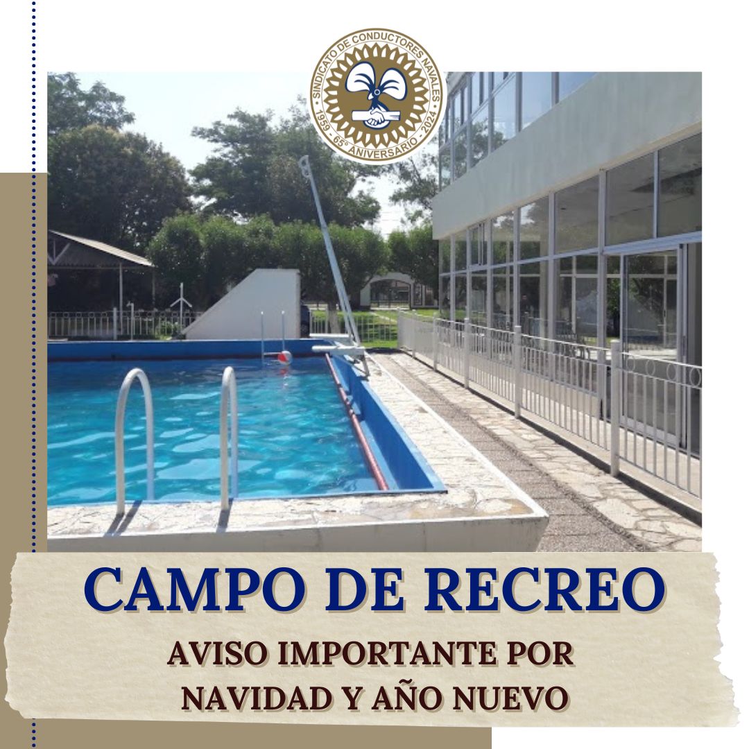 Estimados/as Afiliados/as, Informamos que los días 24/12 y 31/12 el Campo de Recreo permanecerá abierto hasta las 18 hs. y los días 25/12 y 01/01/2025 estará cerrado por día festivo.