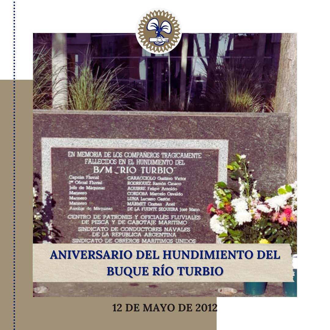 Estimados/ Afiliados/as Este 12 de mayo se cumplen 12 años del Hundimiento del Buque Río Turbio, tras un accidente en el Río Paraná de Las Palmas, donde lamentablemente fallecieron 7 tripulantes. El remolcador de empuje “Ava Payagua” de bandera paraguaya, chocó con el buque arenero “Río Turbio”, de bandera argentina,...