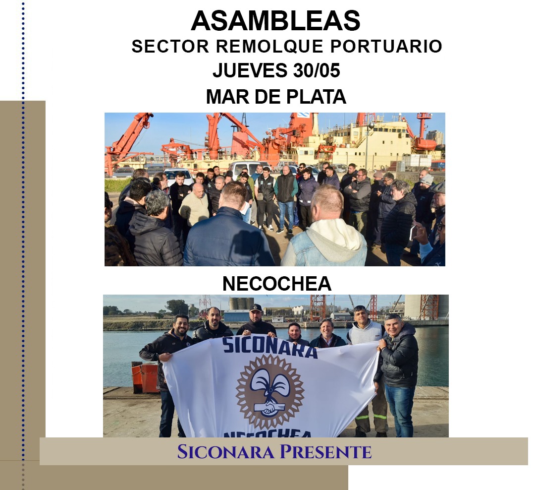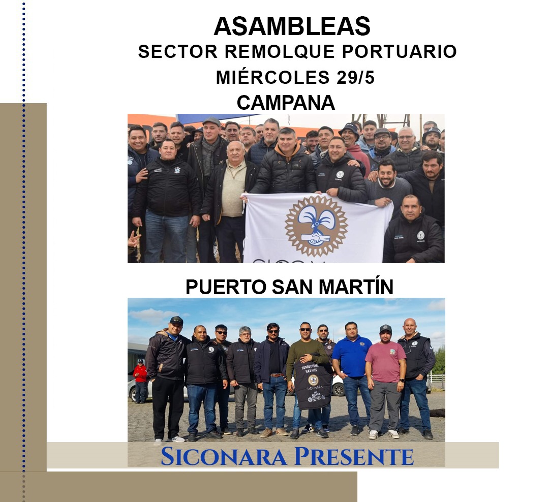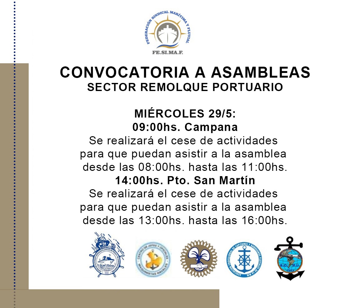 Estimados/as Afiliados/as CONVOCATORIA A ASAMBLEAS SECTOR REMOLQUE PORTUARIO Se realizarán asambleas en los siguientes puertos: MIÉRCOLES 29/5: 09:00hs. Campana Se realizará el cese de actividades para que puedan asistir a la asamblea desde las 08:00hs. hasta las 11:00hs. 14:00hs. Pto. San Martín Se realizará el cese de actividades para que...