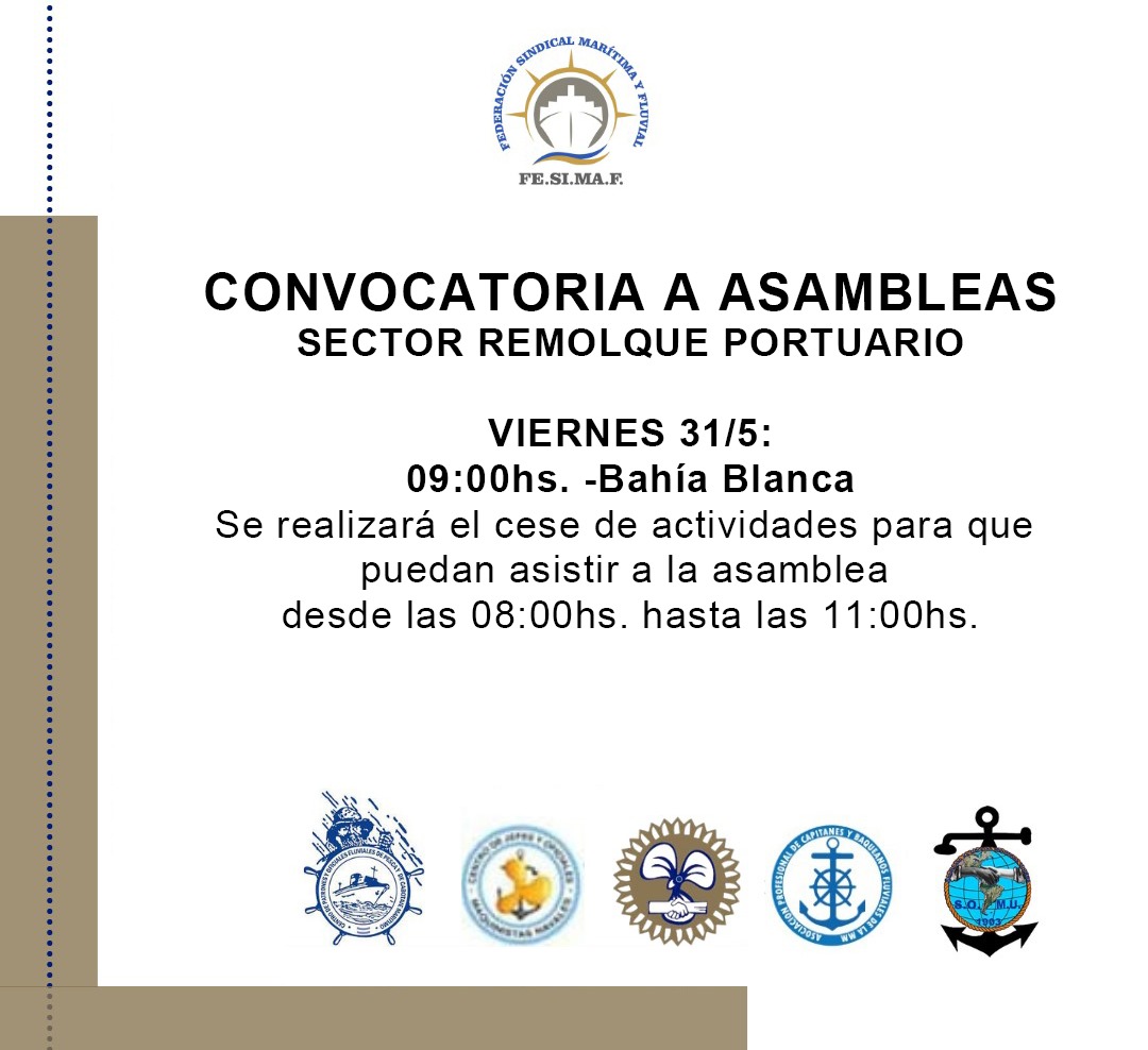 CONVOCATORIA A ASAMBLEAS SECTOR REMOLQUE PORTUARIO Se realizarán asambleas en los siguientes puertos: VIERNES 31/5: 09:00hs. -Bahía Blanca Se realizará el cese de actividades para que puedan asistir a la asamblea desde las 08:00hs. hasta las 11:00hs.