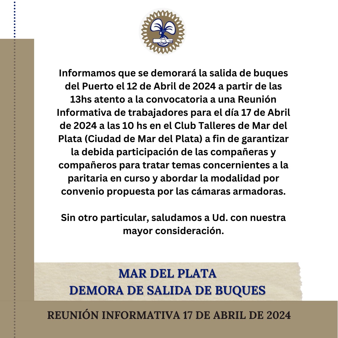 Estimados/as Afiliados/as Informamos que se demorará la salida de buques del Puerto el 12 de Abril de 2024 a partir de las 13hs atento a la convocatoria a una Reunión Informativa de trabajadores para el día 17 de Abril de 2024 a las 10 hs en el Club Talleres de...