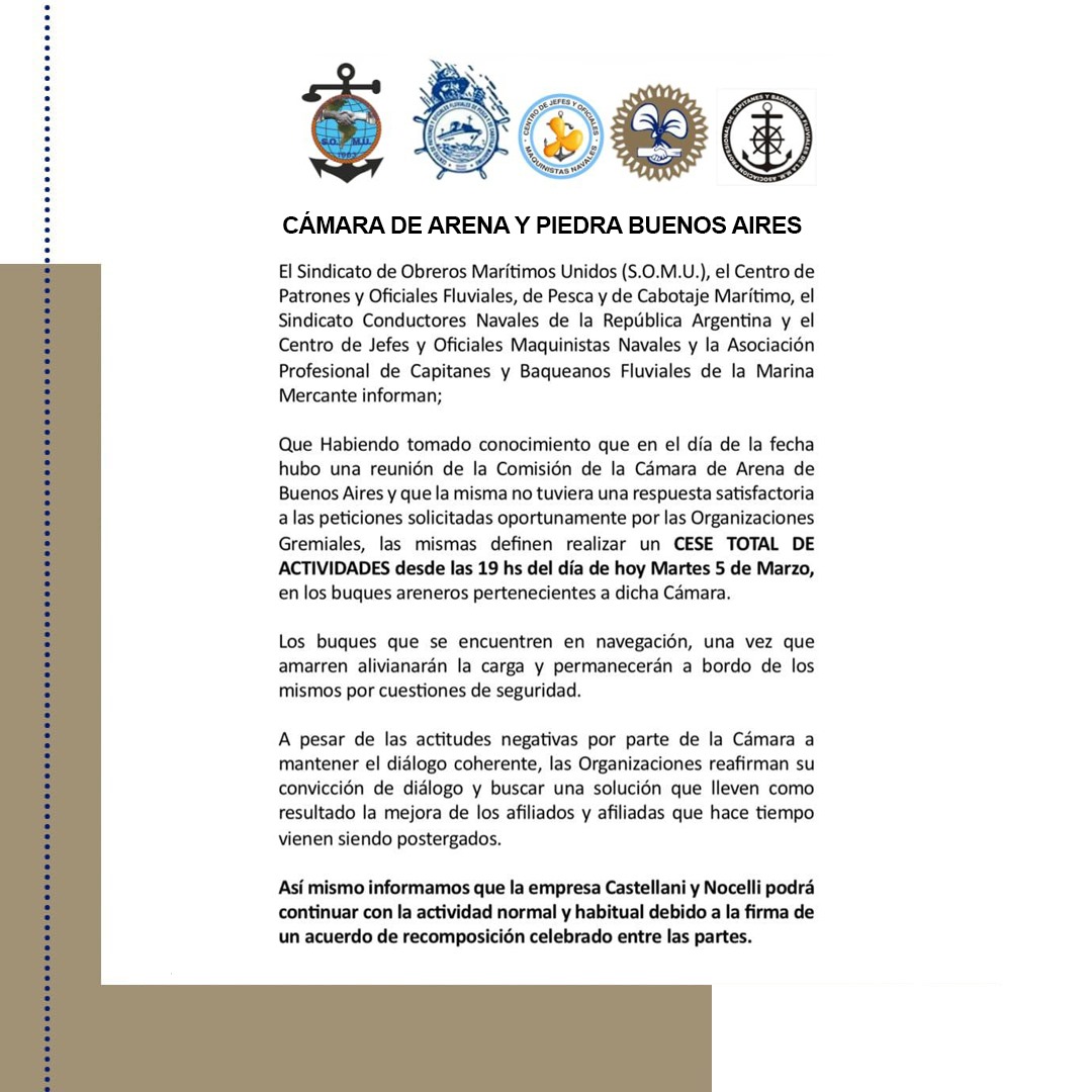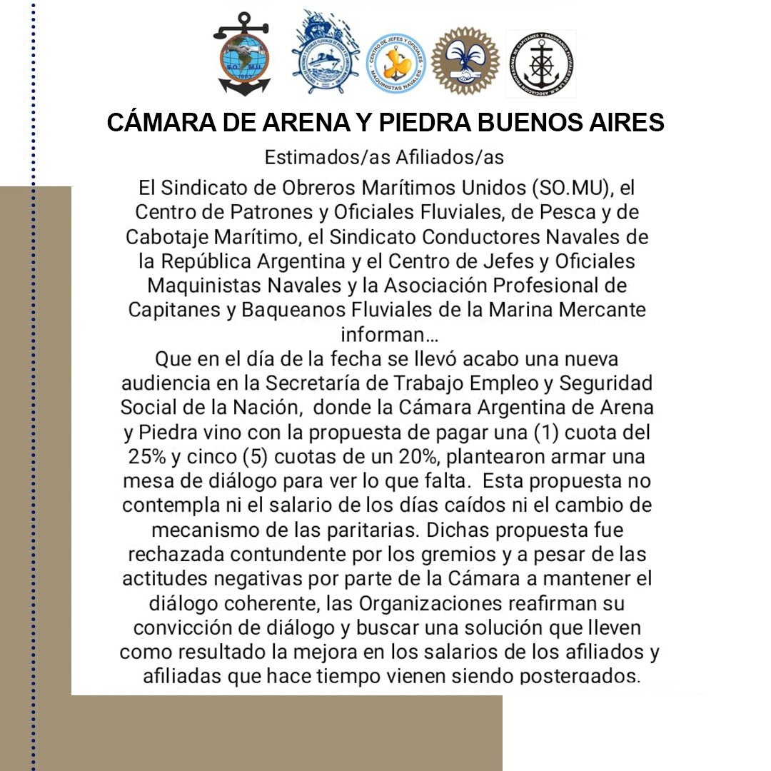 Estimados/as Afiliados/as El Sindicato de Obreros Marítimos Unidos (SO.MU), el Centro de Patrones y Oficiales Fluviales, de Pesca y de Cabotaje Marítimo, el Sindicato Conductores Navales de la República Argentina y el Centro de Jefes y Oficiales Maquinistas Navales y la Asociación Profesional de Capitanes y Baqueanos Fluviales de la...