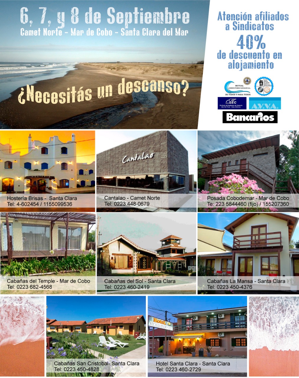 Fin de semana de merecido DESCANSO FAMILIAR Estimado/as afiliado/a Queremos compartir las promociones para el fin de semana del 6-7 y 8 del mes de Septiembre en Camet Norte, Santa Clara del Mar y Mar de Cobo. ¿TE LO VAS A PERDER? Reservá en cualquiera de los hoteles que nuestra...
