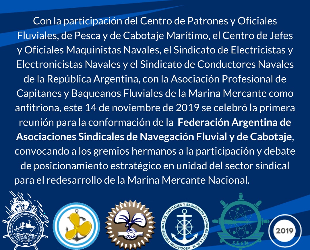 Estimado/as afiliado/as El día 14 de noviembre nos reunimos con los gremios FLUVIALES con el objetivo del análisis y debate para la conformación de una FEDERACIÓN ARGENTINA DE ASOCIACIONES SINDICALES DE NAVEGACIÓN FLUVIAL Y DE CABOTAJE. El lugar fue en la Asociación Profesional de Capitanes y Baquenos Fluviales de la...
