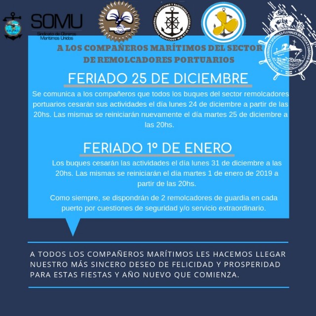 En éstas fiestas el Consejo Federal, la Comisión Directiva Central y todos los delegados del interior les deseamos a todos los Conductores, Motoristas Navales y sus familias unas FELICES FIESTAS. UN FRATERNAL SALUDO Y LOS MEJORES AUGURIOS PARA EL 2019