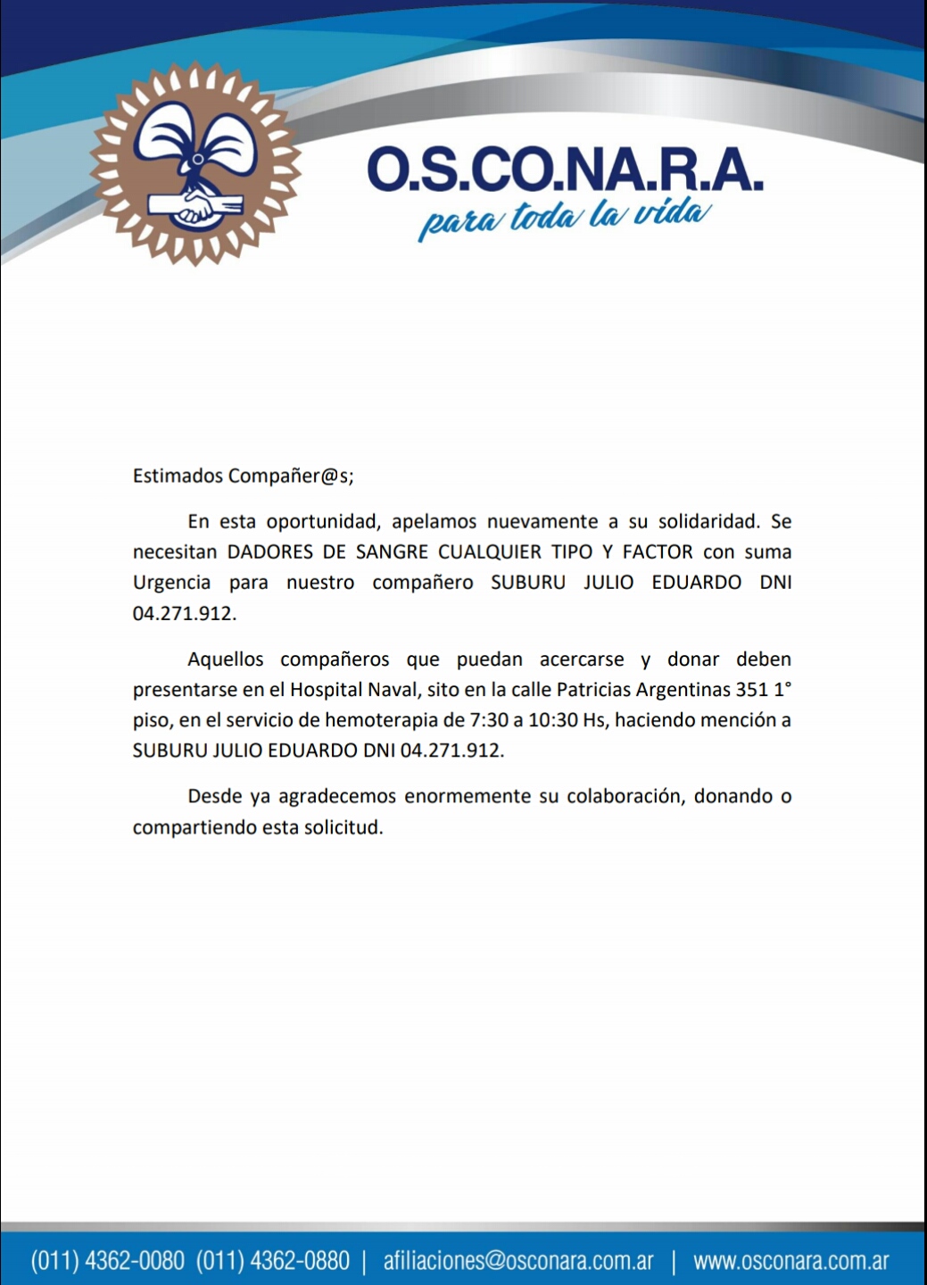 Apelamos a la solidaridad de los compañeros a fin puedan donar sangre para nuestro afiliado SUBURU JULIO EDUARDO.