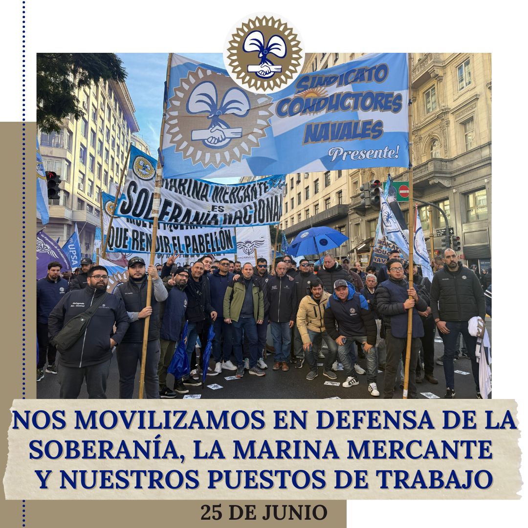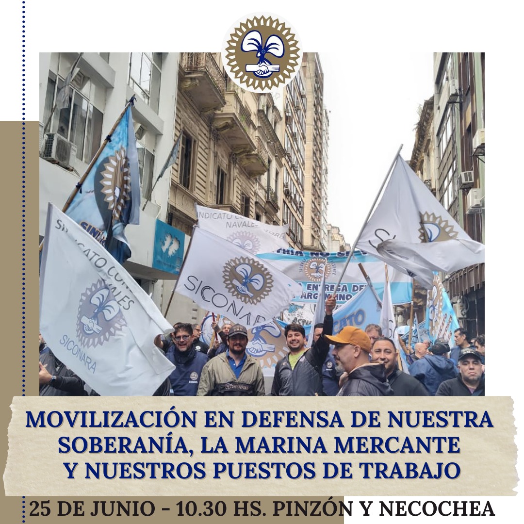 Estimados/as afiliados/as, El próximo miércoles 25 de junio participaremos de la movilización hacia el Ministerio de Desregulación convocada por el Frente de Lucha por la Soberanía, el Trabajo Digno y los Salarios Justos, en rechazo al Decreto 340 que desregula la Marina Mercante, perjudicando ampliamente nuestra soberanía y nuestros puestos...