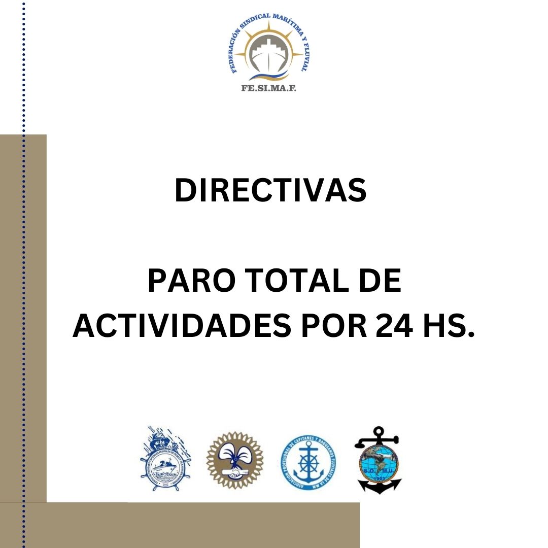 Estimados/as afiliados/as, Ante las recientes medidas de desregulación impulsadas por el Gobierno Nacional, y condensadas en el inconstitucional DNU340/25 denominado “Régimen de excepción de la Marina Mercante”, SICONARA y el Centro de Patrones y Oficiales Fluviales, de Pesca y Cabotaje Marítimo, hemos decidido decretar un paro total de actividades por...