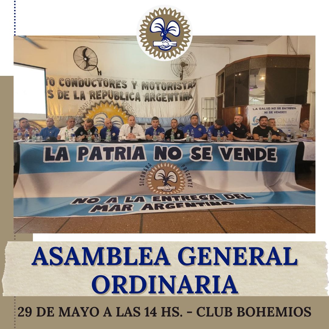 Estimados/as afiliados/as, La Comisión Directiva del Sindicato Conductores Navales de la República Argentina (Si.Co.Na.R.A.), convoca a las/os compañeras/os afiliadas/os a la ASAMBLEA GENERAL ORDINARIA que se llevará a cabo el día 29 de Mayo de 2025, a las 14 horas, en la calle Necochea 948 (Club Bohemios) de la...